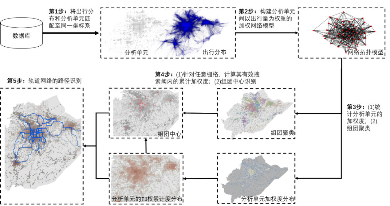 公共交通网络的竞争力很大程度上取决于轨道交通系统的竞争力,因此合理的轨道交通线网布局是实现交通减碳的重要基础。项目提出了一种自动化的轨道线网生成算法,该方法相较于传统的定性方法能够实现客流效益的最大化。以此为目标,项目拟基于惯用的组团思想,提出了如图3所示的析方法。核心思想是利用出行分布的空间组织信息识别组团边界和组团核心,进而识别组团核心间的最优轨道路径。技术的关键难点在于识别轨道客流的主要影响因子。
