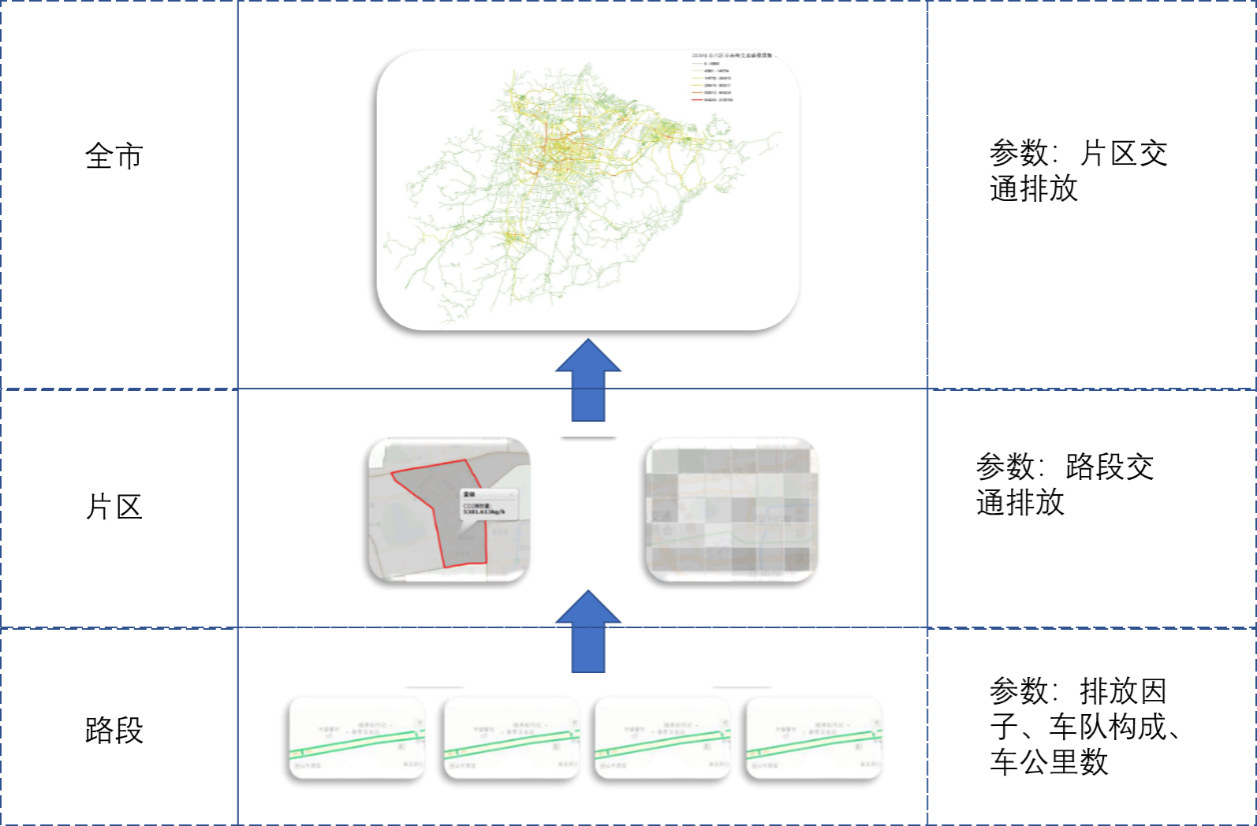 排放模型基于路段的车队构成和车公里数计算得到,片区和全市排放数据可以基于路段数据聚合获得。算法的关键难点在于确定排放因子。