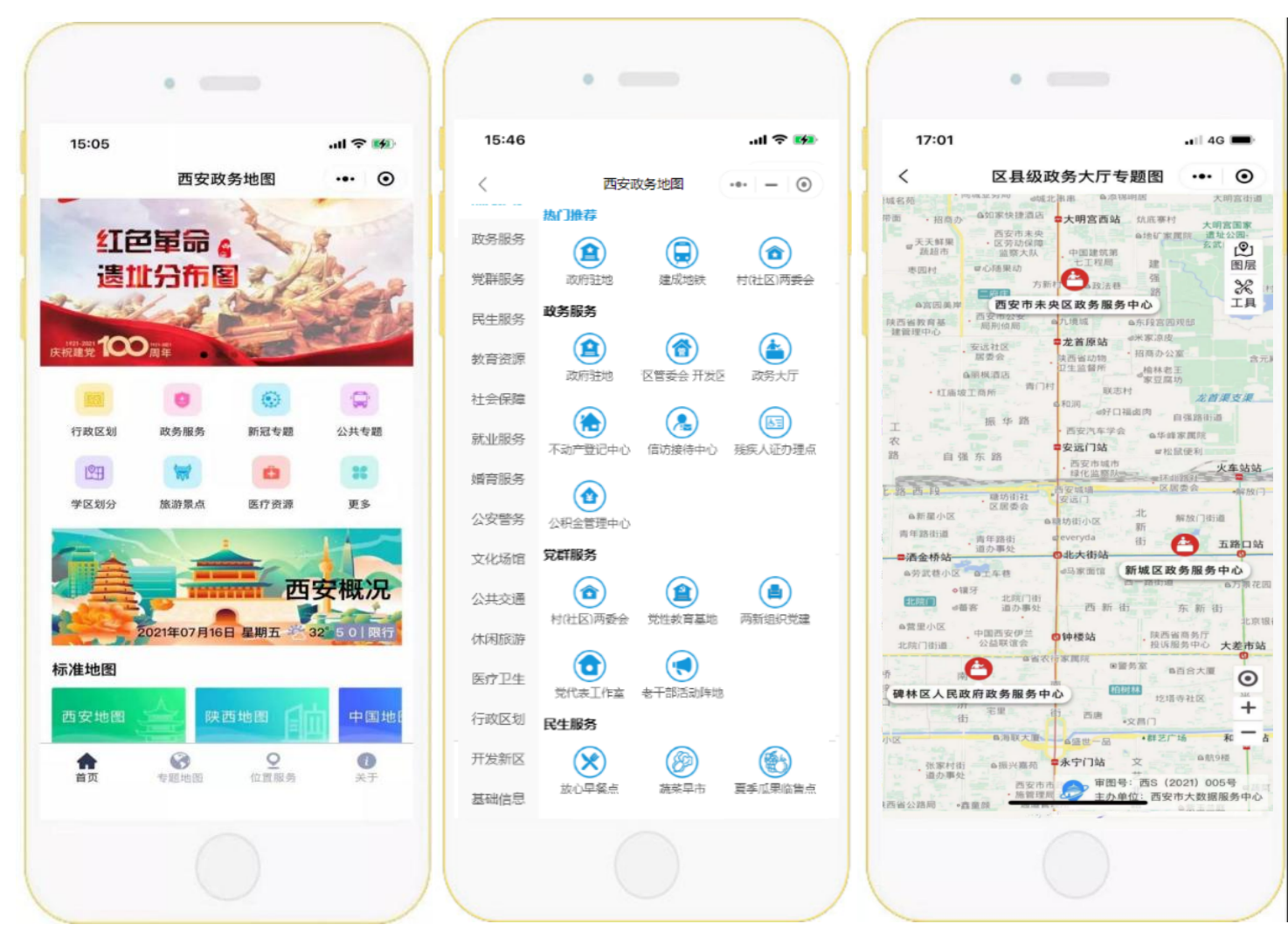 西安政务地图小程序已于2021年7月16日正式上线试运行。小程序覆盖全市域基础地理信息数据,具备高精度地图展示和精准定位服务效果;具备免安装、自适应、高效率等特点;建立了常态化数据更新机制,小程序具备数据时效性高,贴合生活、政务服务相关性高等特性,所有的资源均支持以地图线上浏览和移动端接口对接调用,更好服务全市互联网+政务服务以及数字化转型。小程序特别开设了西安概况板块,分为市情简介、历史沿革、行政区划和人口概况等十个主题,生动展现西安的城市风貌和地域文化特色,此外,标准地图板块提供了国家、省、市三级标准地图浏览服务。