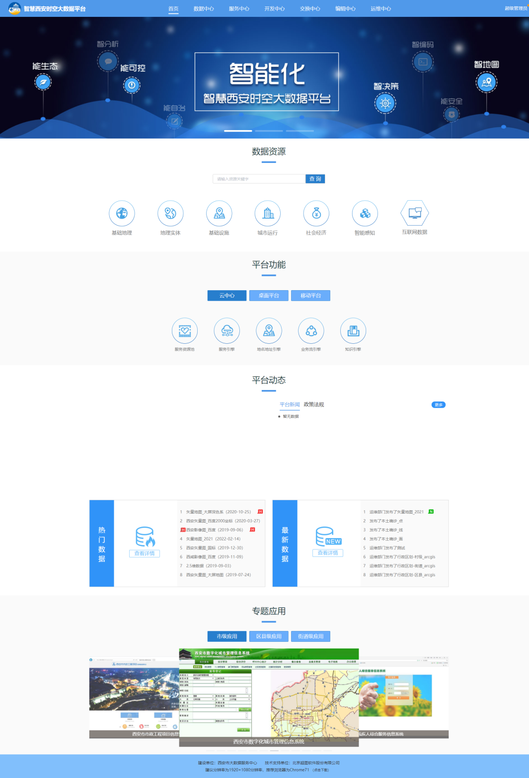“智慧西安时空大数据平台”由西安大数据局指导,西安大数据服务中心组织实施,北京超图软件股份有限公司提供技术支持,为市政府各有关部门提供基础地理信息服务。“智慧西安时空大数据平台”建设包括西安政务地图小程序、智慧西安时空大数据平台(公众版)和智慧西安时空大数据平台(政务版),旨在重点解决全市各委办局在城市管理、市域治理、互联网+政务服务中互联网及移动网络位置服务和政务用图的需求,实现用户基于移动端查图、看图和用图的需求,解决应用精准定位位置服务问题,深化全市城市空间信息服务最后一公里。