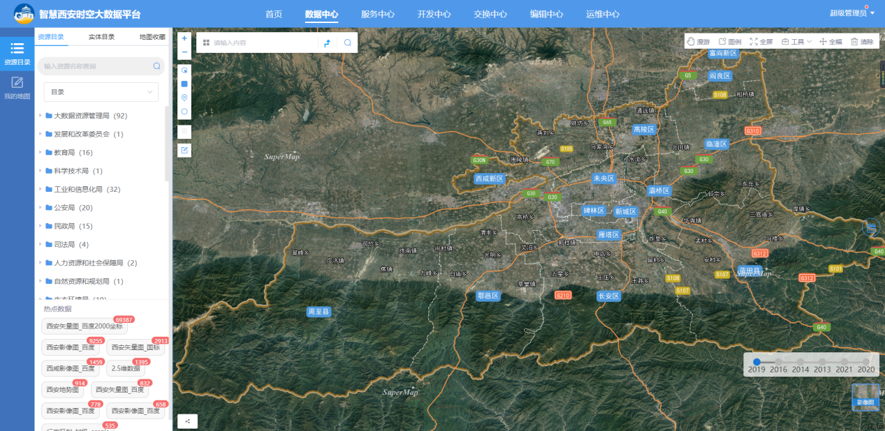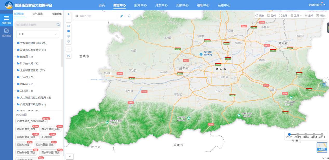 智慧西安时空大数据平台(政务版)已建成覆盖西安市全市域时空基础地理信息数据库,包括1:2000矢量数据及0.5米分辨率影像数据。提供高达21级的多层级地图服务,提供2013年、2014年、2016年、2019、2020、2021年多时效的影像服务。为20多个市级部门、区县提供地图服务,涉及公共资源、生态环境、城市部件、社会治安、脱贫攻坚、教育文旅、气象、城市综治等多个方面的智慧应用。形成多层级、多形式、多方位的应用生态模式。