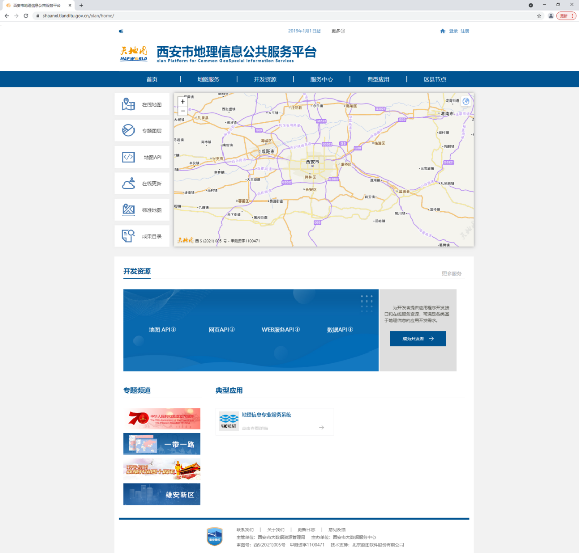 地理信息公共服务平台(公众版)按照自然资源部关于地理信息公共服务的统一标准基础服务、统一应用程序接口、统一域名、统一界面样式、统一用户管理要求,依据西安市最新的权威基础地理信息构建的在线地图服务平台,提上公众服务管理的规范化和服务便利化。