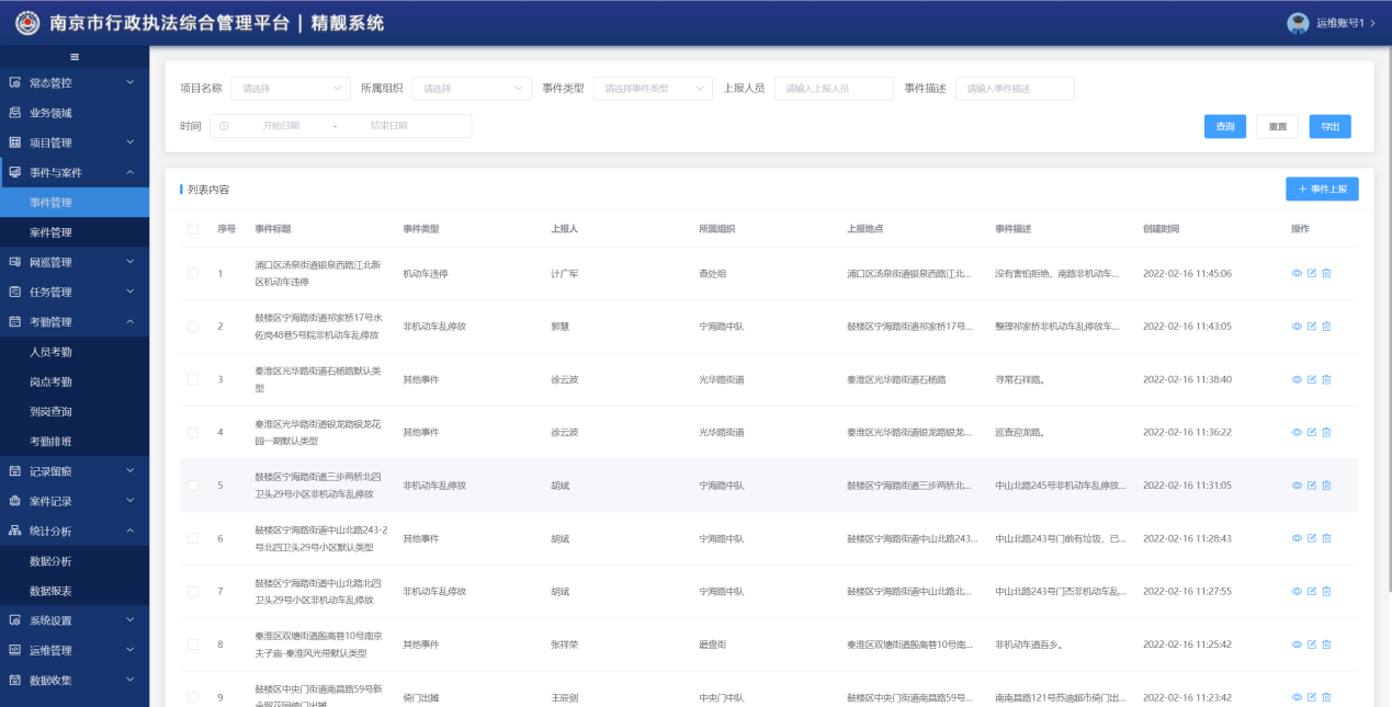 南京城管执法信息化指挥调度系统(精靓系统)可以获取执法人员的精准勤务数据,实时掌握全市2600名执法人员的点位信息、在岗状态、执勤时长、巡查里程、执法轨迹以及事件上报情况,以点对点实时督察,实现执法勤务精细管理、精密管控、精准管辖。