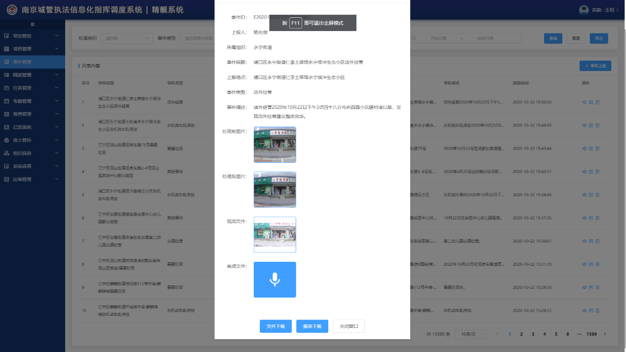 南京城管执法信息化指挥调度系统(精靓系统)引入语音识别技术,实现将语音自动转换成文字,通过执法记录仪的快捷键实现事件的位置、图片、处置过程视频、文字描述的自动关联,事件快速上报,简化执法人员的操作复杂度,提高现场处置效率。以往执法人员通过执法记录仪采集回来的照片、视频等数据需要导入电脑进行二次整理形成台账,现在通过创新的事件上报机制,在平台上自动形成执法全过程记录电子台账,减轻了后续台账整理汇总的工作强度。