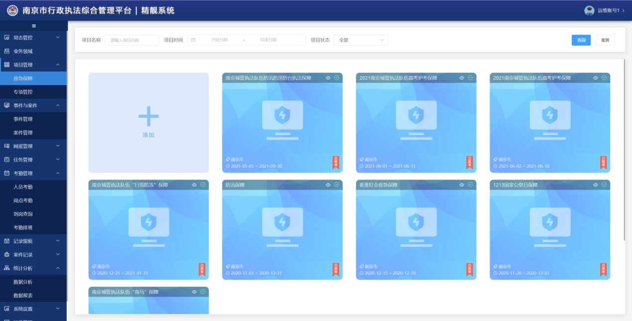 2021年,南京市城管执法总队先后通过该系统完成秦淮灯会、防汛防涝防台防雪保障、国家公祭日、第十一届江苏省园博会南京城管执法保障、中高考护考保障、中高风险地区执法保障等一系列重大专项、应急保障、重大市容环境执法保障任务461次,实现全市队伍协同联动、快速反应、精准保障。