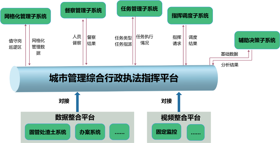 业务架构结合城管执法的职能属性将业务体系划分为基于信息共享的各系统对接和数据交换共享,主要包括以下内容: