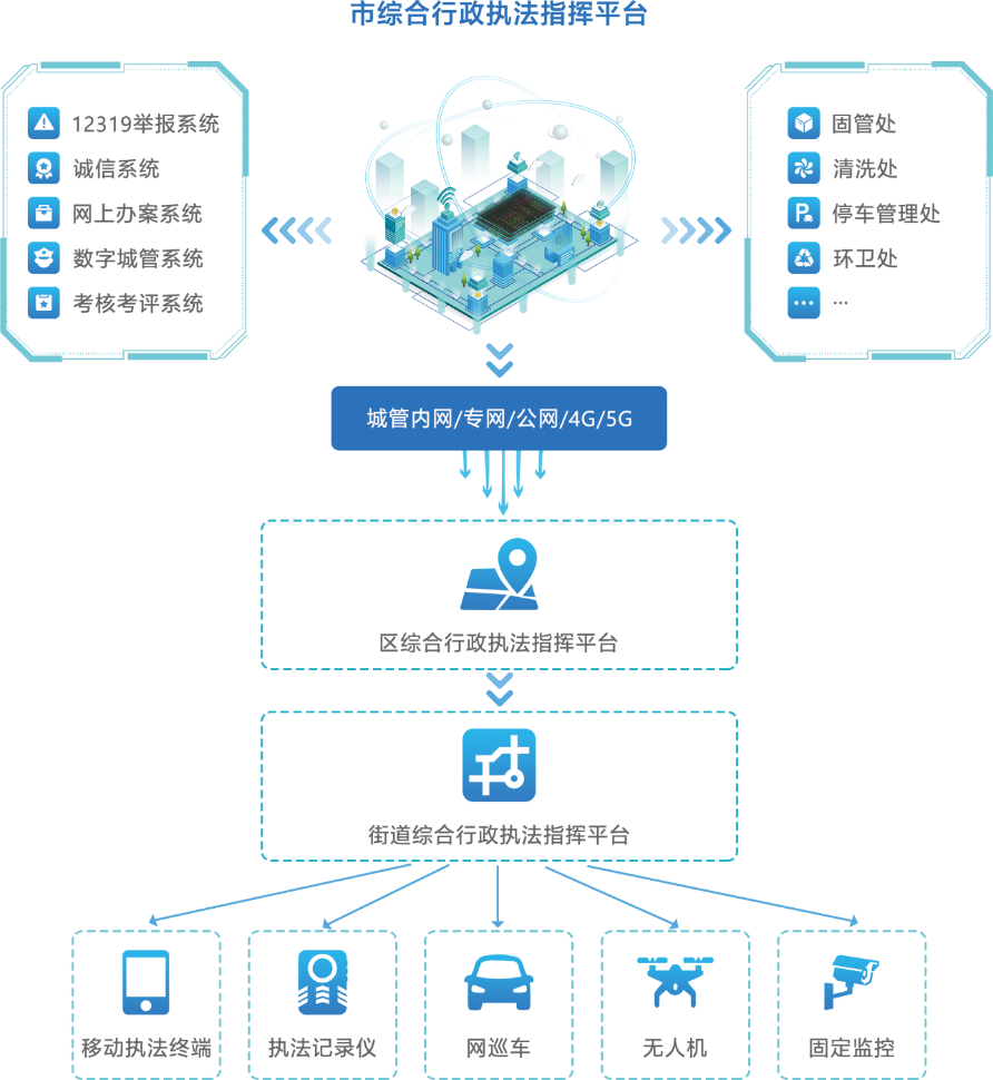 纵向到底:市、区、街道三级指挥到一线执法人员,实现层级管理、督查、业务指导级扁平化指挥调度。
