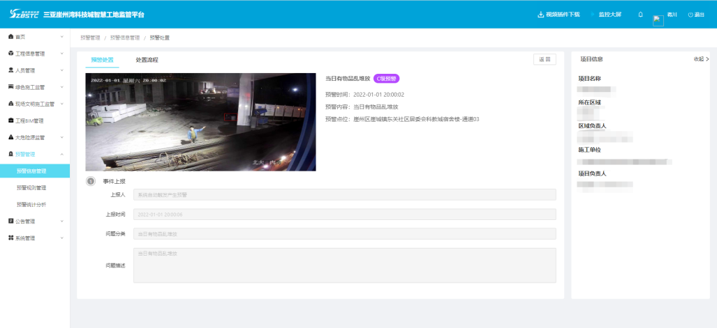 在建工程项目的建筑材料较多,时常会堆放在出入口过道或消防通道,影响在建工程项目人车出行的秩序,造成拥堵和安全隐患。智慧工地监管平台通过归集在建工程项目重点区域监控视频等各类数据,建立物料乱堆放现象识别分析模型,实现对物料乱堆放现象的自动识别并预警,使监管人员能够在第一时间进行处理,保障在建工程项目施工秩序。