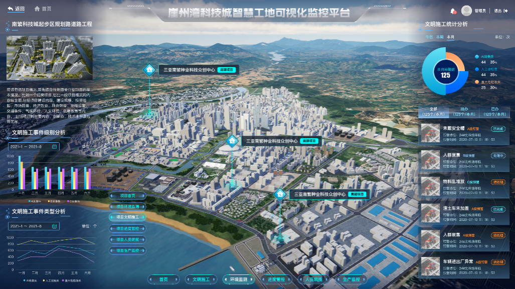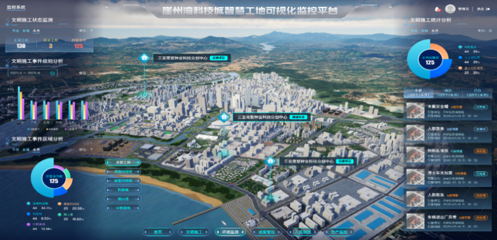 科技城当前正处于高速建设阶段,大量工程项目集中开工,在建工程数量多、体量大、分布不均等多问题并存,为监管带来巨大挑战,急需突破传统以人工巡查为主的监管方式。为了进一步提升科技城在建工程的安全监管能力,加快推进工程项目的规范化建设,增强信息化安防技术在工程项目安全管理领域的支撑作用,确保在建工程安全文明施工和科学规范管理,三亚崖州湾科技城智慧工地监管平台项目(以下简称:智慧工地监管平台)的建设至关重要。