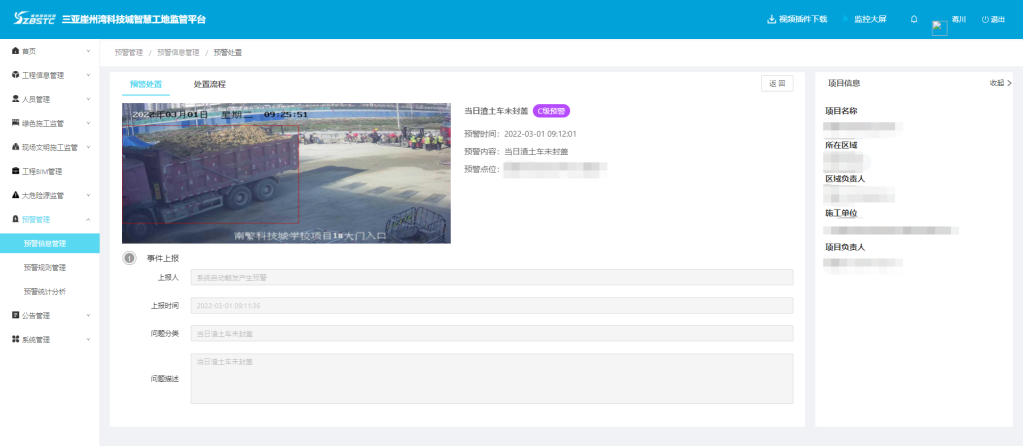 渣土是在建工程项目在施工过程中产生的建筑垃圾,需渣土车运送到指定的地点进行倾倒处理,渣土车在运送渣土的过程中,需对车上的渣土进行封盖,以免掉落或扬尘,产生二次垃圾并影响环境。智慧工地监管平台通过归集在建工程项目重点区域监控视频等各类数据,建立渣土车未封盖现象识别分析模型,实现对渣土车未封盖现象的自动识别并预警,有效的降低渣土车未封盖对周边环境的影响,同时将抓拍的数据进行存储记录,便于事后追责。