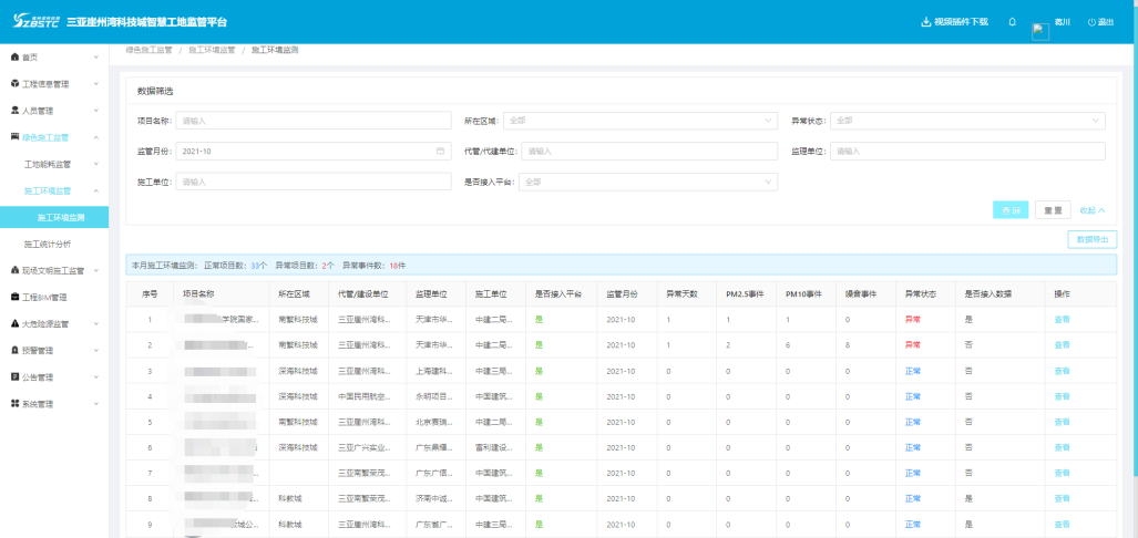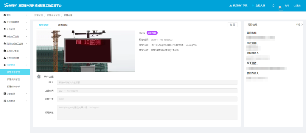 在建工程项目施工过程中产生的噪音和扬尘会直接影响科技城的环境及群众生活,但是传统在建工程项目在建设过程中对噪音和扬尘无法有效关注,导致环境污染比较严重。智慧工地监管平台接入了各个工地PM2.5、PM10、噪音等传感器,实时获取在建工程项目环境数据,同时在平台中对设备数据设置预警阈值,结合AI+大数据分析,当出现异常情况则进行预警提醒,并自动联动工地端对应的智能化设备,有效的保护在建工程项目周边环境的质量。