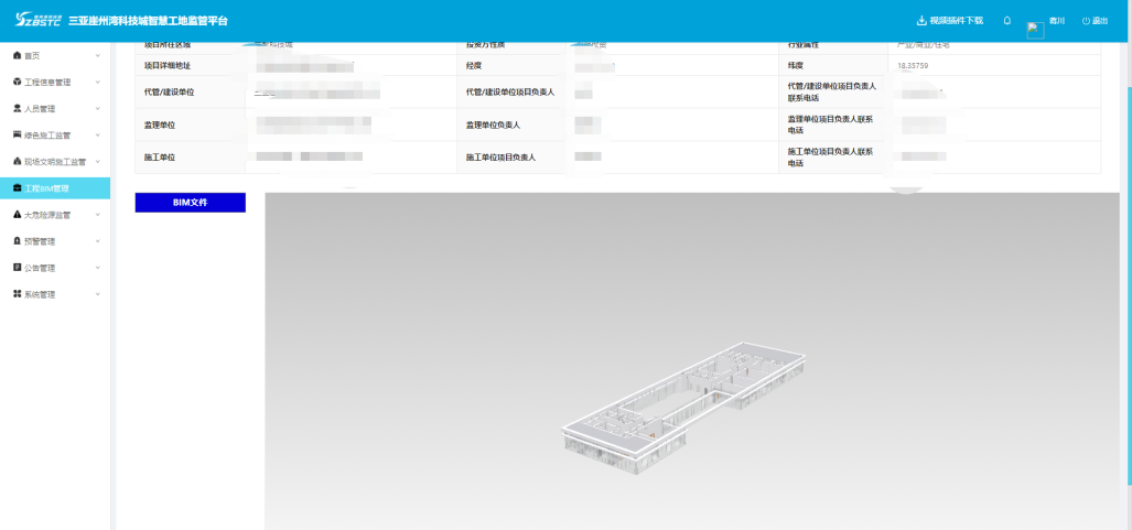 根据科技城对在建工程项目的要求,所有在建工程项目必须进行BIM建模,通过BIM管理模块对辖区内在建工程项目BIM模型文件进行统一管理,实现对模型文件的查询、下载、更新以及BIM轻量化模型展示,可对BIM模型进行横切、剖切、旋转等操作,更加直观、精确地反映整个建筑的完整设计模型情况。同时,实现对各在建工程项目建筑BIM模型数据的沉淀管理、快捷查询,满足科技城对辖区项目BIM模型文件数据的收集和管理。