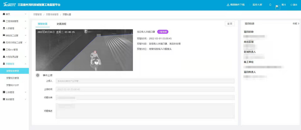新型冠状病毒已蔓延至全国各地,做好自身安全防护是每个人力所能及且最行之有效的方法。专家一再强调,佩戴口罩可以防止飞沫传染,是切断病毒的主要传播途径。目前,监管人员通过人工巡检方式对未戴口罩者进行监督教育,这不仅需要大量人力,同时监管人员的安全也不能保证,而且容易出现漏看、不看等情况。智慧工地监管平台通过归集在建工程项目重点区域监控视频等各类数据,建立未戴口罩现象识别分析模型,实现对未戴口罩现象的自动识别并预警,同时结合智能客服第一时间提醒监管人员对未戴口罩人员进行培训教育,强化个人防疫意识,降低疫情传播风险。