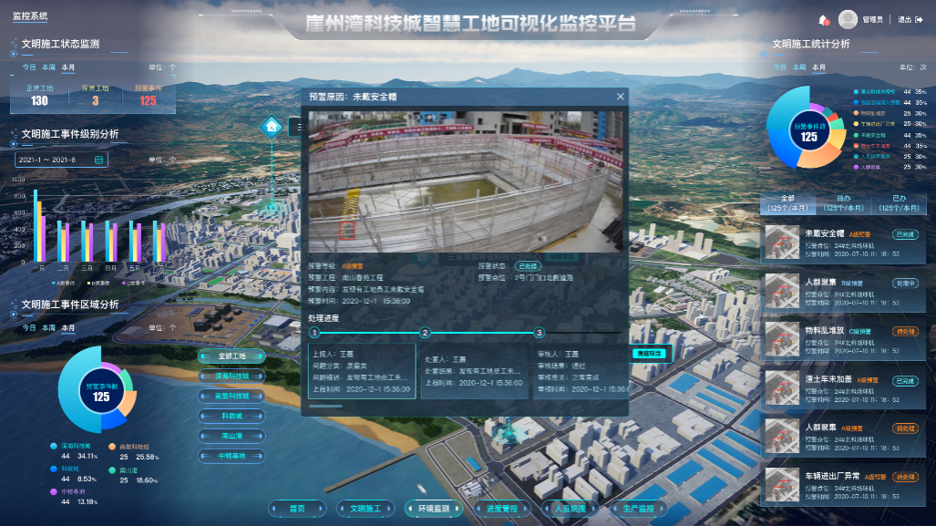 智慧工地监管平台围绕在建工程,重点关注项目施工过程,通过数据融合,将各业态各事件等在数字孪生中精准呈现,实时掌握项目建设情况。该场景以全流程、全覆盖的方式,实现工程全生命周期监管,打破单一工地监管模式,一屏统揽科技城在建工程建设情况。通过AI能力,对在建工程内安全帽未佩戴、渣土车未封盖、物料乱堆、未戴口罩、重大设备设施等安全隐患进行自动识别并预警,同时在数字孪生平台快速定位实时呈现,便于管理人员有效监管,打造一个安全清洁的施工环境。