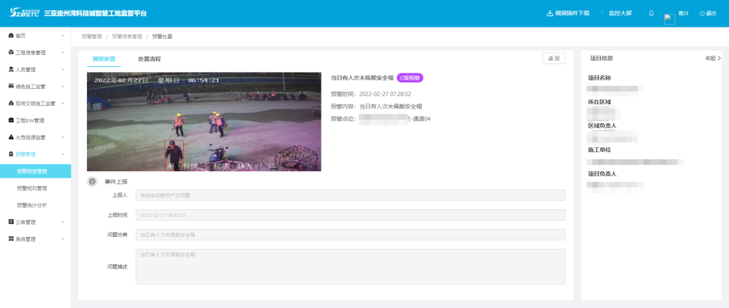 人员进入在建工程项目现场佩戴安全帽是基础要求,但少部分人员安全意识低,经常出现未戴安全帽进入在建工程项目的现象。智慧工地监管平台归集在建工程项目重点区域监控视频数据,建立安全帽未佩戴现象识别分析模型,实现对安全帽未佩戴现象的自动识别并预警,有效保障工人的生命财产安全,提高在建工程项目安全监管能力。