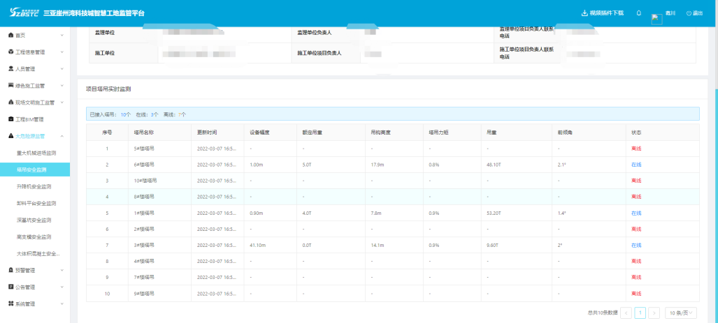在建工程项目在建设过程中,需要众多重大设备设施进场,如塔吊、深基坑、卸料平台等,各个设备是否正常运行关乎整个工地人员的安全。传统在建工程项目在建设过程中,仅能通过施工人员经验进行判断,经常因判断失误而引起施工事故。管理人员通过在设备上安装不同类型的传感器,可实时获取设备运行数据,并将设备运行数据上传至智慧工地监管平台,同时在平台中对设备数据进行预警阀值设置,结合AI+大数据分析,当出现异常情况则进行预警提醒,监管人员和工地现场人员就能第一时间进行处理,降低发生人身伤亡和工程事故的概率,保障现场人员人身安全。