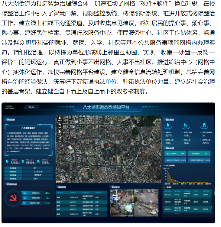 1、建设党建引领城市基层治理信息化平台和区街指挥调度中心,助力市南区提升精细化治理水平,实现一屏通览、一网共治。按照“统一网格、统一人员、统一资源、统一事项、统一服务”的标准要求,整合升级党建、综治、城管等现有数字化管理平台,对网格服务、城区环境等事件开展信息采集、智能分派、预警处置、监督考核等全周期管控,一网统筹形成全区合力,实施综合治理,实现“一网统管”。同步在街道和社区层面开展网格智慧治理,逐步实现城区治理智慧化,提升基层治理科学化、信息化、智能化水平,实现“小事不出网格,大事不出街道”。提升网格化管理水平,推进城市管理精细化,构建城市治理新格局。市南区事件发现率提升了25%,响应时间提升了30%,处置好评率提升了12%,得到了民众一致好评。