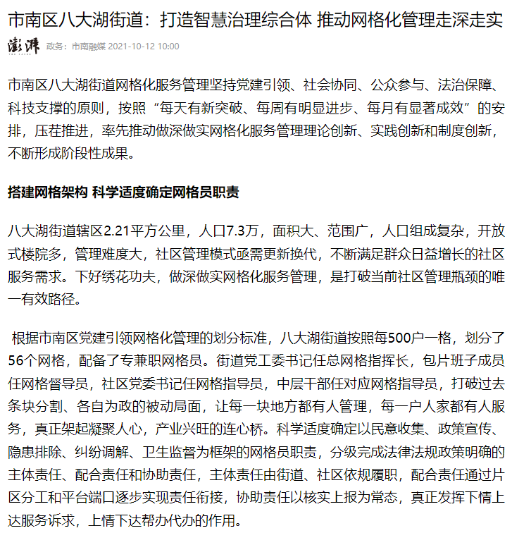 青岛市南区发布全域党建引领基层治理示范区工作要求《市南区全域党建引领城市基层治理示范区建设行动方案(2020-2021年)》,“结合智慧城区建设,推进党建引领城市基层治理信息化平台建设,制定方案和预算”,建设党建引领城市基层治理平台,进一步提高治理精细化、智慧水平,全面起势、奋力突破推进基层治理现代化。