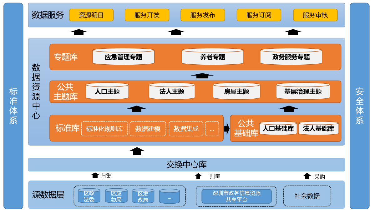 建设数据标准库、公共基础库、公共主题库、专题库等组成的数据资源中心。建设集约化的数据标准库,将对龙岗区交换中心库中的原始数据进行统一标准化处理形成数据标准库;优化公共基础库中已建设的人口、法人基础数据库的模型和数据架构,满足各业务应用的需要;建设基层治理、人口、企业、房屋主题库,为建设养老、应急管理、政务服务等专题库以及其他应用提供数据支撑。