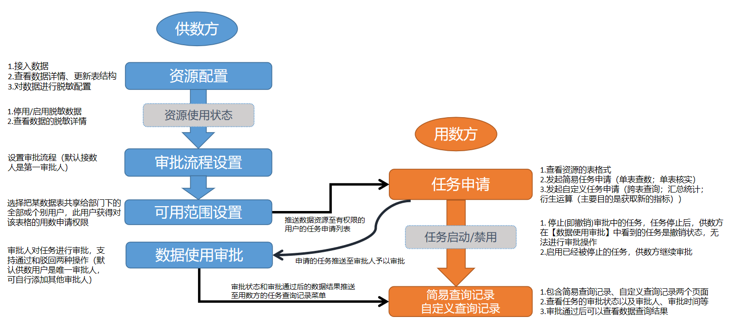 4. 针对政务数据资源服务建立各个流程节点建立数据流程监控机制,依托流程考核事项周期评估流程,提升数据从需求到管理端之间的监管和评估能力;