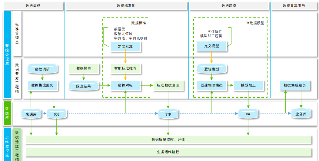 数据资源中心是对数据汇聚中心存储的数据,可以对汇聚龙岗大数据平台的数据进行管理和加工处理,通过大数据治理和数据质量管控后,实现数据加工过程和结果可管理可看。大数据治理模块目标是解决数据治理过程中数据不集中、标准不统一、质量不可控、交付周期长等一系列问题,通过标准化工具和智能化方法,将杂乱无章的基础数据治理成有价值的数据资产,实现数据的价值化和业务化。