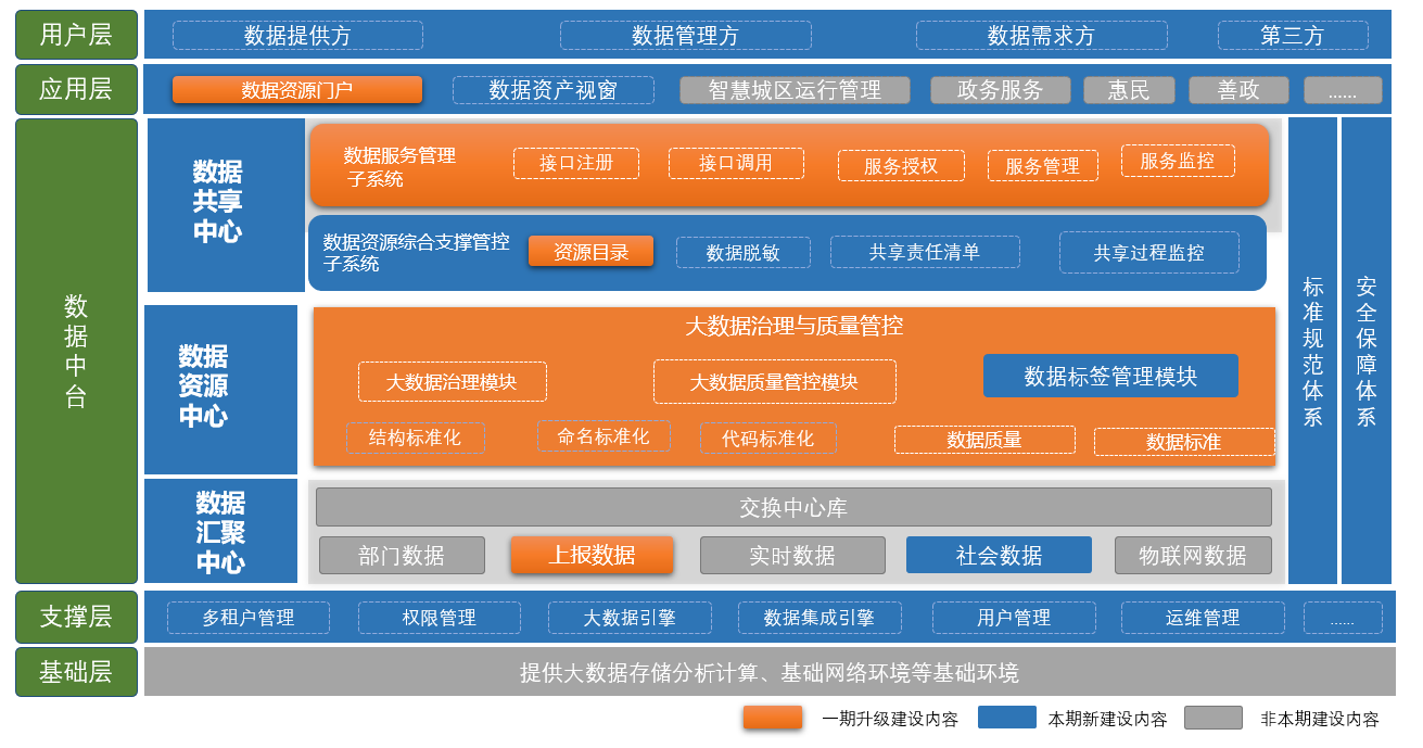 基础层是利用龙岗区统一的大数据管理平台的现有能力,支撑整个数据中台的建设,利用平台的能力包括但不限于:离线计算能力、实时计算能力、数据存储能力、网络能力、通讯能力等。该层只是通用能力的复用,不存在具体建设内容也不在此次建设范围内容。