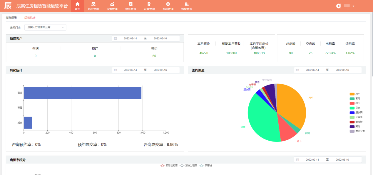 辰寓住房租赁智能运管平台实时对所有业务线进行统计分析,突出展示运营管理者感兴趣的数据或者图表,方便管理者一目了然掌握全部门店经营信息。