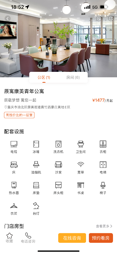 在公众号或小程序的引流之下,用户可以通过下载的“辰寓”APP进行更为详细的房源查看,包括房型价格差异、房间配套、管家联系方式等。