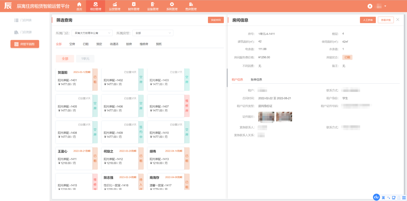 针对主流的集中式青年公寓租赁业务,辰寓住房租赁智能运管平台以房屋平面图的形式为管理者、店长、管家呈现一目了然的房源状态管理,包括每层楼每间房的实时状态、合同到期时间提示、欠账提示、租客身份详情等信息。同时支持按期自动推送房租账单、自动根据智能设备能耗推送水电费账单,极大减少管家房源管理的工作量。
