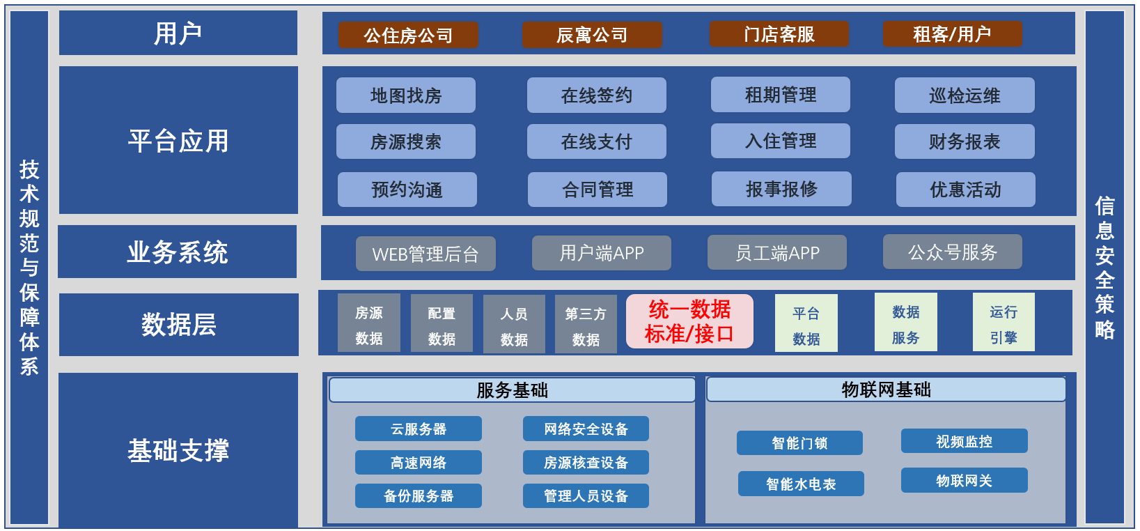 在总体架构图中,按层级架构主要分为基础层、数据层、业务层、应用层: 基础层:基础层是整个智能运管平台的基础底座,主要包含移动云服务基础和智能设备的物联网基础。其中移动云服务基础提供:云服务器、网络安全设备、高速网络、数据库及其备份等功能,是整个平台建设的基础,平台所有数据和应用也都统一部署在此基础之上;而物联网基础则提供所有住房租赁相关的智能设备全方位管控服务,包括随时查看房屋视频监控、房屋智能水电表读数和控制、智能门锁控制、其他物联网设备管控等。
