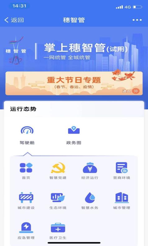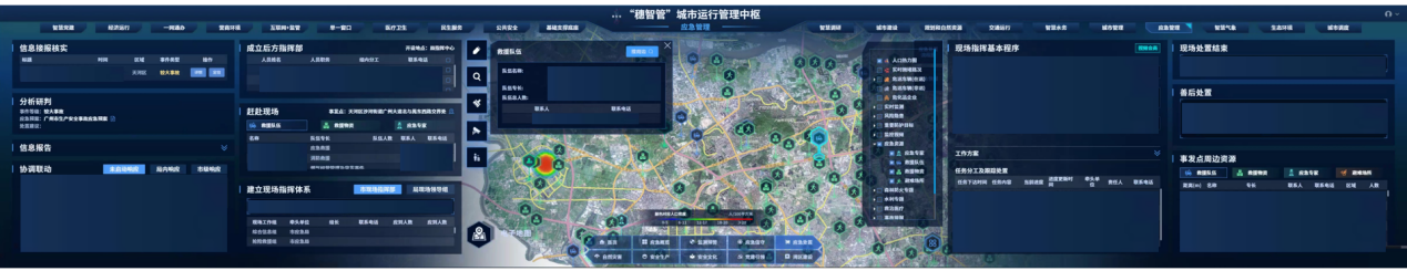 截至2022年3月,“穗智管”城市运行管理中枢1.0版本已完成建设并投入试运营,同步开发了系统的大屏、中屏(PC端)、小屏(手机端)端供市领导和相关业务职能部门使用。该平台作为领导和部门决策的指挥部、驾驶舱、调度台,通过对城市运行体征和事件进行全时段、全维度、全景式的运行监测、预测预警、协同联动、决策支持、指挥调度,实现“一网统管、全城智治”。