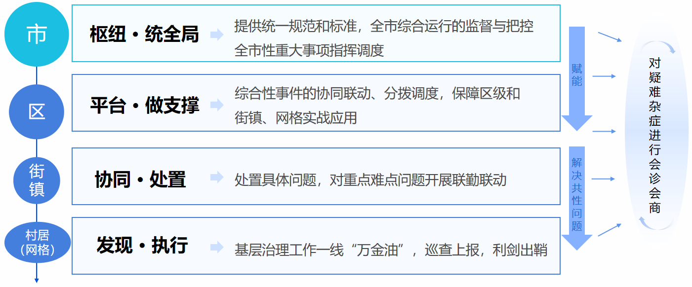 图4 “两级平台(市、区)、四级管理(市、区、街(镇)、村居(网格))”治理架构