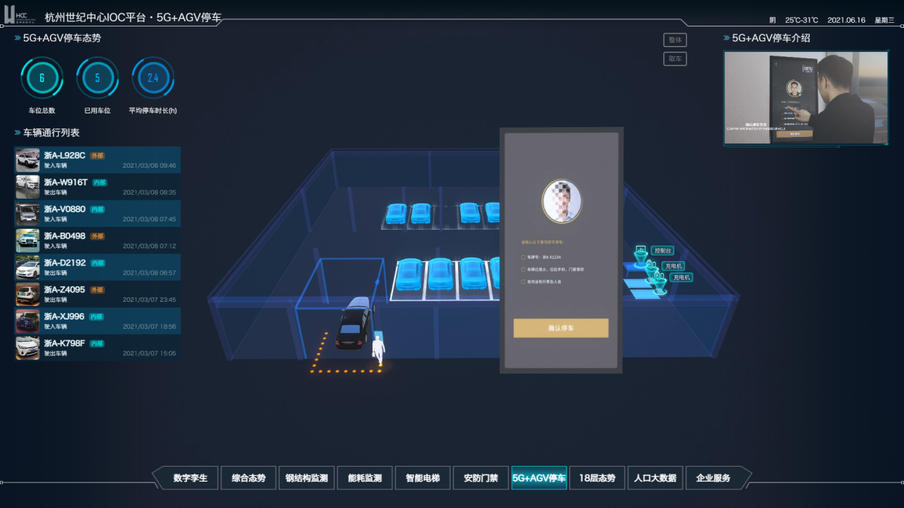 这个也是世纪中心超高层建筑的5G特色应用之一。基于5G的低延时、高带宽的特点,AGV可以实现机器人自动泊车。这将大大提高出入口通畅度,节约人力和时间成本。平台完成AGV自动泊车系统的动态接入,实时反应AGV机器人的设备状态,包含实时车牌车辆信息、AGV电量、是否载车、雷达定位情况、安全检测情况、车位可用数量等等,并将AGV车库内的摄像头画面实时呈现。