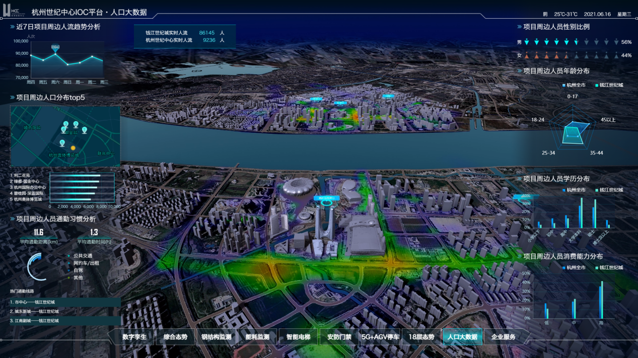 平台引入联通手机信令大数据,为杭州世纪中心提供一个更加客观、全面、动态的视角,为杭州世纪中心提供周边交通潮汐分析、城际跨域流动OD分析、通勤特征分析、产业集聚分析等超过多项大数据分析模型及数据服务,并通过大屏的方式展示杭州之门周边及钱江世纪城板块的大数据全景沙盘,并实现颗粒度逐步细化、层层深入将项目全景、入驻风貌、招商动态、人员流动、通勤特征、目标客户、服务资源、客流分析等信息进行系统化的反映。