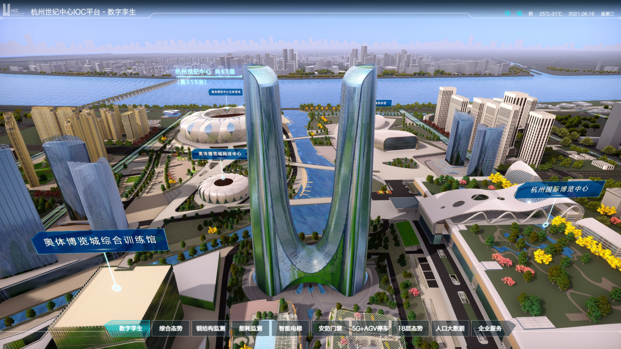 杭州世纪中心是世界级城市新地标,旨在打造融合商业零售、商务办公、酒店餐饮、公寓住宅、综合娱乐五大核心功能于一体的“城中之城”(功能聚合、土地集约的超高层城市经济聚集体)。楼宇位于钱塘江南岸,由杭州市委、市政府规划的奥体博览城核心位置,规划总建筑面积64万平方米。在超高层规划建造技术已成熟应用的基础上,杭州世纪中心进一步融入国际最前沿的智能技术,建设智能运营管理IOC平台为核心的智慧楼宇引用体系,打造超高层产品示范。杭州世纪中心的智慧化建设,围绕新技术、新应用、新模式的前沿展现以及“人”在城市之门的需求为重点,突出以人为本的智慧内涵;凸显先进性,满足浙江省、杭州市政府以及全市人民对新地标的期待,成为实现数据开放共享、前沿科技赋能的深度融合,高层次办公、高水平生活、高质量消费、高标准生态的有机统一,将世纪中心努力建设成为数字经济新时代的全球超高层地标创新发展的先行地和制高点。