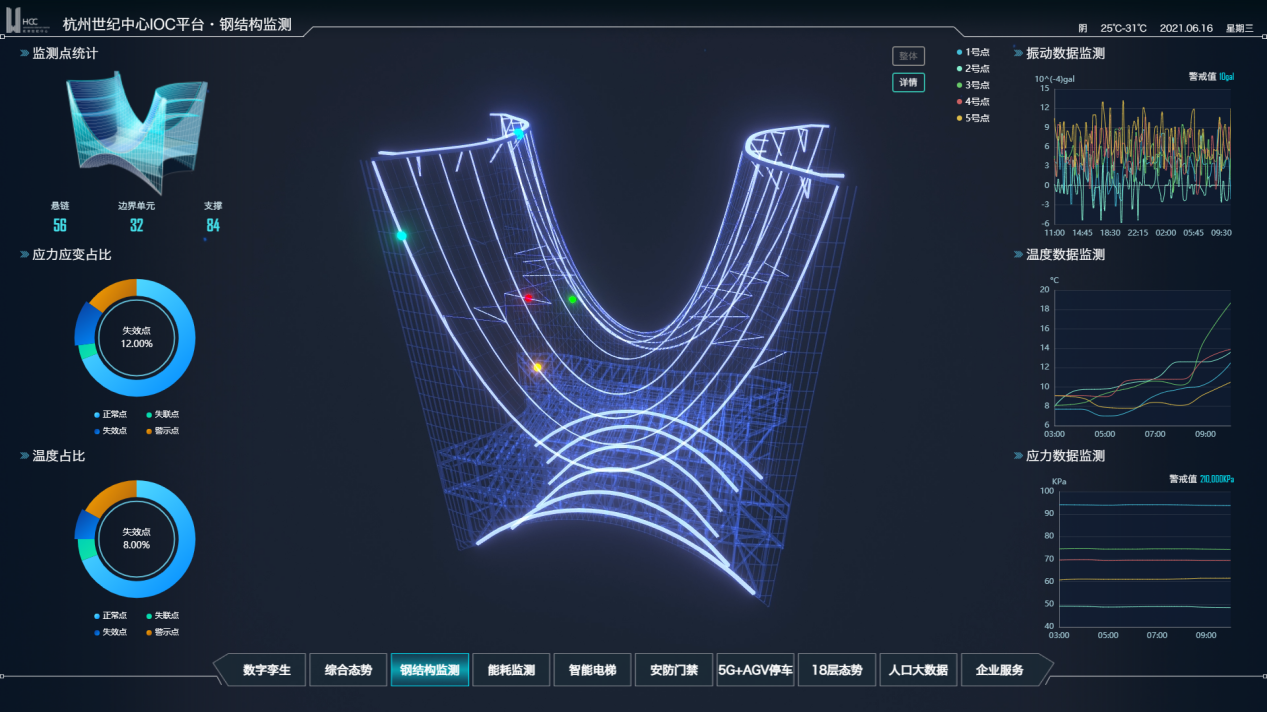 钢结构是本建筑的设计亮点,采用亚洲乃至世界首创的大型悬垂双曲马鞍型屋面。平台引入了结构健康监测系统,通过对振动、温度以及应力数据的实时抓取,实时跟踪它的结构内力动力特性,确保结构的安全性,在面对诸如地震、台风等极端条件时,及时对结构安全进行评估。
