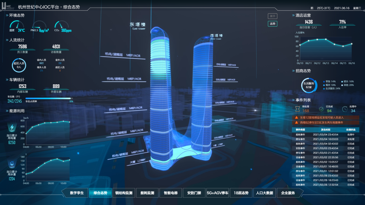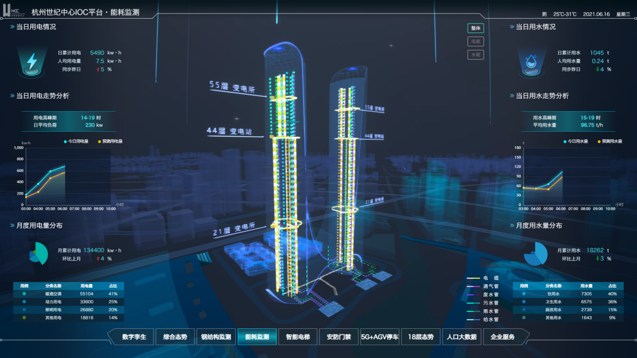 2、杭州世纪中心数字孪生平台的建设,助力智能建筑节能减排,具有良好的环境效益,一是在大厦内部,自动控制的温度、湿度及新风量,可为人们提供安全舒适、通信现代化的办公环境,提高办公效率;二是对外而言,智能建筑的节能效益可直接减少能耗,从而对减少环境污染做出贡献。