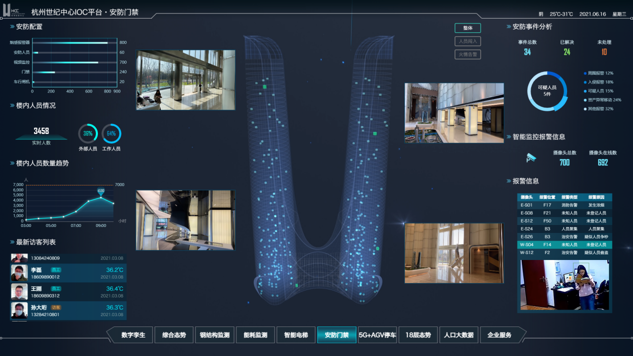 通过对楼内人、事、物的统一管理和监控,保证楼宇的安全高效运行。在人员管理方面,对楼内的人员密度,访客情况进行监测。平台通过调取样板区视频监控系统的实时视频流或者存储的视频流,将人员ID与人员画像及门禁卡关联,实时显示人员的运动轨迹路线,并基于AI能力智能识别的陌生可疑人员的报警信号,回传到平台上实现实时定位和呈现。视频监控系统通过IOC平台集成与门禁系统、人行通道系统设置联动,对报警时的图像、时间和状态进行记录,实现报警图像的视频复核。在系统中显示监控区域的人员分布统计数据,并以人力分布热力图的形式展示监控区域或整个楼宇的人员分布情况。在事件管理方面,基于楼内全覆盖的摄像头监控体系,实现异常人员进入、火情等安防事件的智能快速发现、报警和联动处置。在物的管理上,楼内配备了智能安防管理设备,包括智能门禁、烟感、摄像头等安防智能设施的配置,可实现异常事件的及时发现与监控视频的多路实时查看。