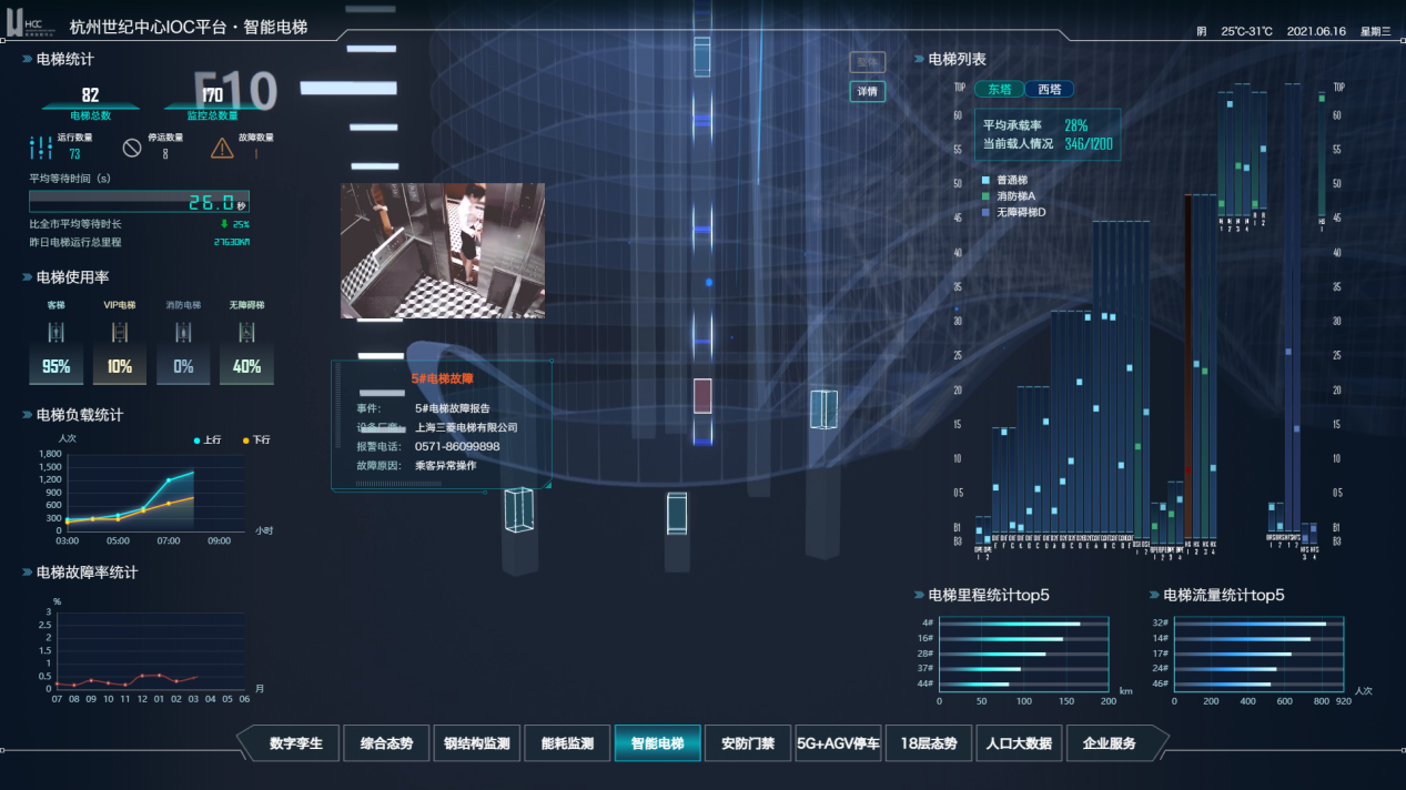 4.4 智能电梯监控:楼宇共计80余部电梯,平台通过与塔楼的电梯系统对接,采集的环境监测实时动态数据,比如运行状态、流量、故障报警等信号展示,便于校核系统运行状况进行绩效分析。该模块清晰展现了大厦电梯的高效、安全与智能,在效率方面,平台对电梯使用率、负载情况和平均等待时长均进行了数据采集和分析。在安全方面,平台对电梯的实时运行速度、运行方向、位置等在三维模型上实时呈现,并且当事件发生时,平台可对电梯事件和监控视频进行AI识别,并查看事件详情,便于后续的事件处置。在智能方面,平台可对电梯总体运行情况进行统计分析,辅助动态派梯策略。