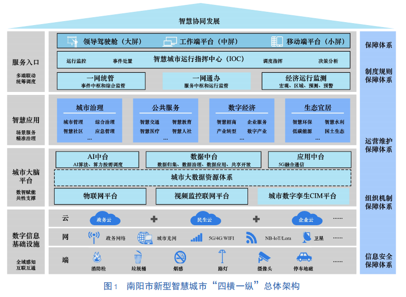 类数据资源、聚焦城市发展关键领域为途径,在现有“四统一、四领域”总体架构基础上深化构建南阳市新型智慧城市“四横一纵”总体架构。其中“四横”包括数字信息基础设施、城市大脑平台、智慧应用、领导驾驶舱,“一纵”即新型智慧城市保障体系,包括制度规则保障体系、运营维护保障体系、组织机制保障体系和信息安全保障体系。南阳市新型智慧城市“四横一纵”总体架构如图 1 所示。