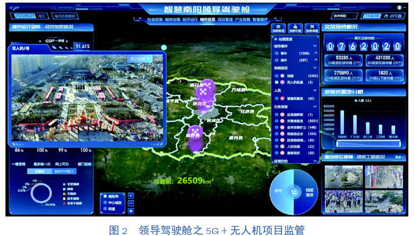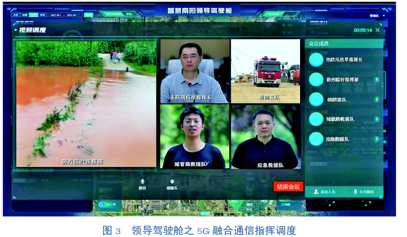1)城市运行监测体系建设:以城市大脑融合治理南阳市现有数据为支撑,一期重点围绕应急指挥(应急救灾)、社会治理、项目管理、疫情防控4 领域,参照国家标准,并结合南阳实际,设计城市运行核心指标,完成10个主题大屏及相关算法系统的建设,对南阳市城市运行态势进行实时监测与可视化呈现,支撑领导决策。针对监测体系发现的问题和风险,基于城市大脑提供的统一的5G融合通信能力,实现视频会商和处置过程中的可视化指挥调度,提升城市运行重大事件处置效率(见图2和图 3)。
