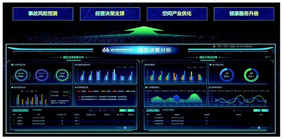 园区运营管理平台利用园区大数据支撑平台,实现对辅助决策应用功能,通过利用多源数据融合、大数据关联分析等多种算法分析模型,反映事件的最新态势及当前态势的演化趋势,为园区决策者提供决策支持(见图 15)。
