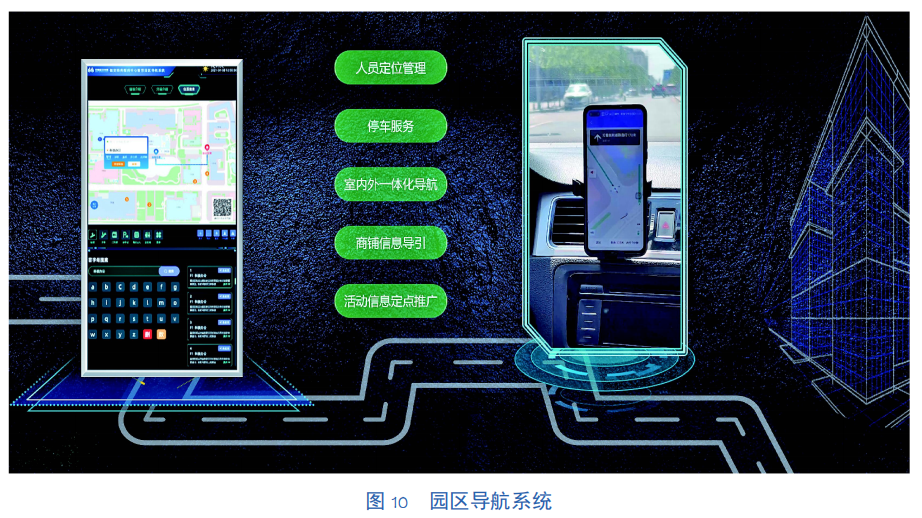 商服园区导航系统真正意义上实现了室内外一体化导航能力,通过GPS 技术+分布在园区内2万多个蓝牙信标,组成了一套园区定位专网,为到访商服的用户提供停车服务、室内精准导航、活动信息查阅等功能(见图10)。