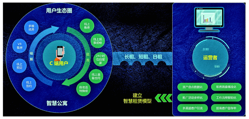 用户可以在园区统一的App上体验到全生命周期的公寓服务。在来访前可以在App上查看心仪房间的 VR全景图,然后可以在线上进行预定,届时运营人员可以在PC管理端跟踪到预约信息,带领用户参观心仪房源。之后在敲定细节后可以进行线上的预定,在缴纳定金后可以在线上完成房源的签约、合同的签订。在租后,用户同样可以在线上查看园区内的其他业态提供的多样服务,包括打折信息、商场活动信息、商铺开业等,同时如果房间设备出现损坏,可以便捷地在App 上进行一键报修,运营人员在查看到相关信息后可以安排工程师提供定时上门服务,为用户从租前到租后一整个生命周期的便捷服务(见图8)。