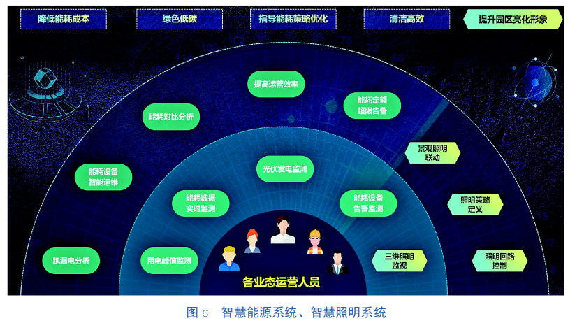 能源和照明系统基于对能源设备的实时检测,为运营人员提供了各种能耗辅助分析优化、照明策略控制的功能,最终达到降本增效的最后目标。其中实时检测包括了用电峰值检测、能耗数据实时检测、光伏发电检测、能耗设备告警检测、三维照明监视,对园区的各种能耗设备进行状态和表计读数的检测(见图6)。