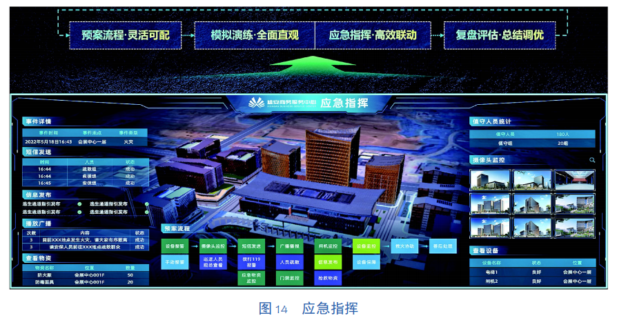 园区运营管理平台具备与各业务系统的实时联通能力,从而实现一体化的协同指挥联动控制,并反馈于各业务系统,实现事前预知、事中协调、事后复盘的闭环流程,为园区管理者提供完整的预案可视化流程,实现管理者对园区整体事件处置的可视化经营。通过建立预案、配置要素、配置流程,实现协同指挥的数字化管理。在实际协同指挥中,通过选择配置好的预案,并可根据实际进行相应要素配置调整,对园区系统设备进行联通控制,实现协同指挥的可视化智能管理,从而达到园区各类事件的及时和准确响应(见图 14)。