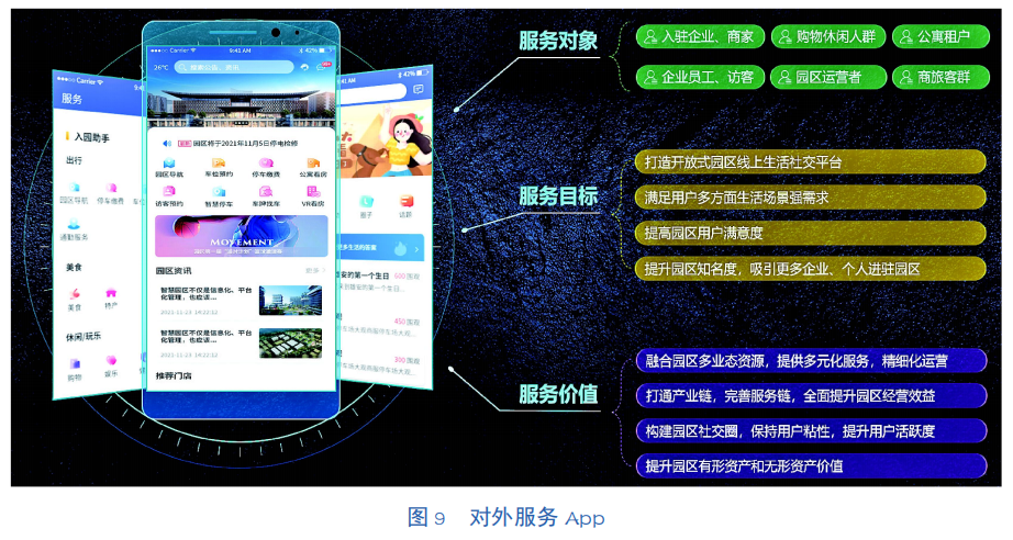 为公众和企业提供智能多元化服务:为公众提供访客预约、园区导航、停车缴费、公寓看房、智慧停车等一系列精细化服务,为企业员工提供访客邀约、服务申请、报事报修、会议预约等特定场景服务,满足用户群体多方面生活场景的强需求,提高园区用户的满意度。通过攻略、活动、圈子、话题等主题功能,构建园区社交圈,抓住与用户生活息息相关的内容,保持用户的黏性,为园区吸引更多的用户流量(见图9)。