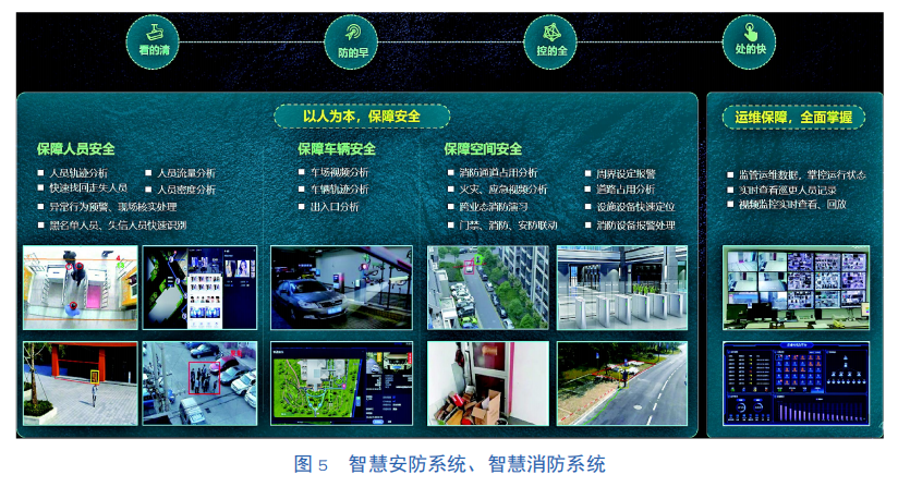 智慧安防系统、消防系统基于视频支撑平台及物联网平台能力,主要用于全园区的视频数据及烟、水、电、可燃气体、报警等多种数据进行采集,安消系统相融合,实现园区安全全局可知、实时可视,做到看得清、防得早,控得全、处得快(见图 5)。