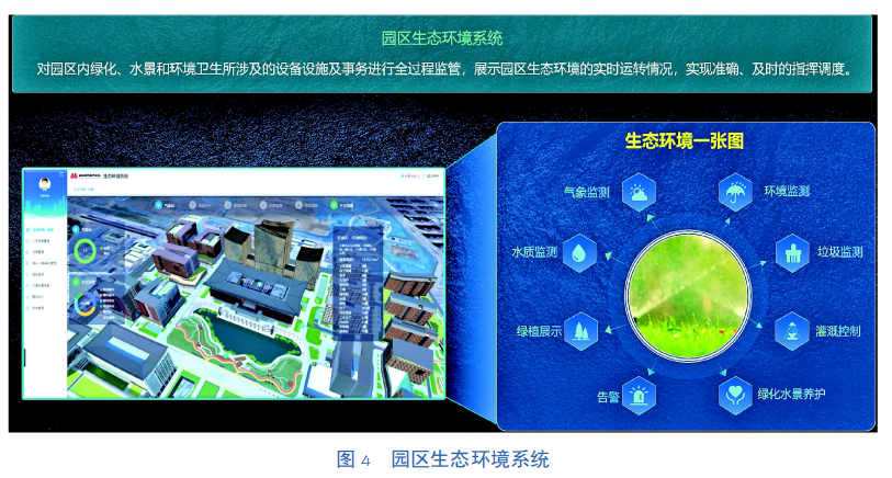 生态环境系统对园区内绿化、水景和环境卫生所涉及的设备设施及事务进行全过程监管,展示园区生态环境的实时运转情况,实现准确、及时地指挥调度(见图4)。