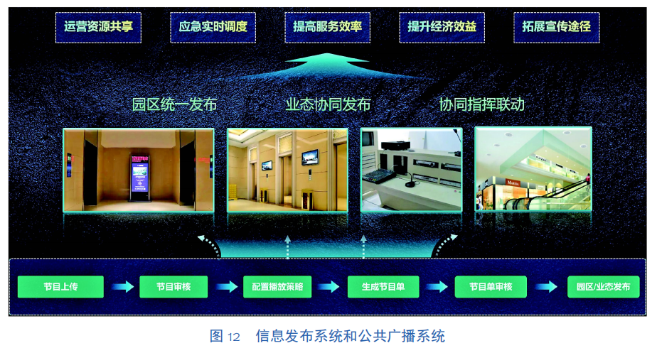 信息发布和公共广播是对园区内的音视频信号资源,根据一套通用的节目发布流程,如节目上传、审核、配置播放策略、生成节目单、节目单审核、园区/业态发布等,通过这一系列的系统操作,进行统一的发布(见图12)。
